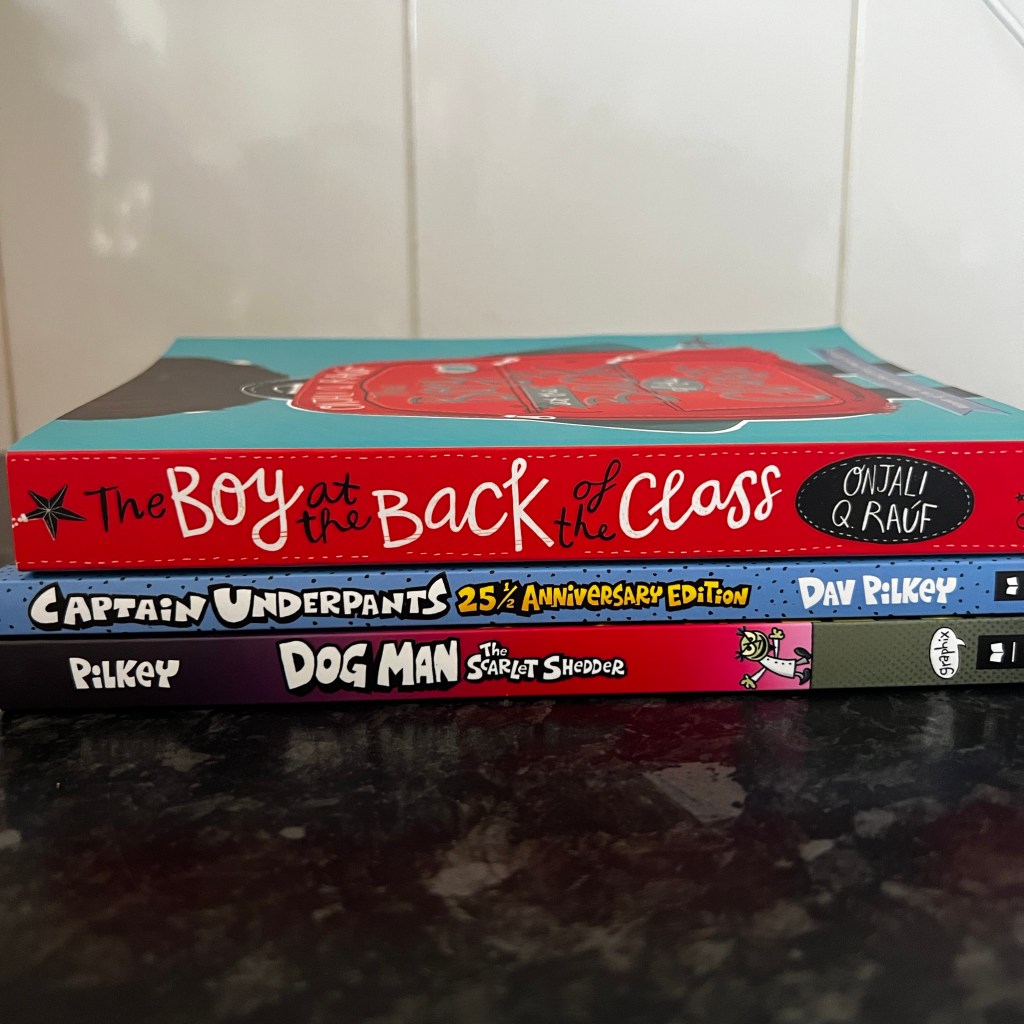 Who doesn’t know Captain Underpants? I’m not sure what’s extra about this anniversary edition—maybe a crossover?—but he was buzzing to grab it. - 🎒 The Boy at the Back of the Class by Onjali Q. Rauf