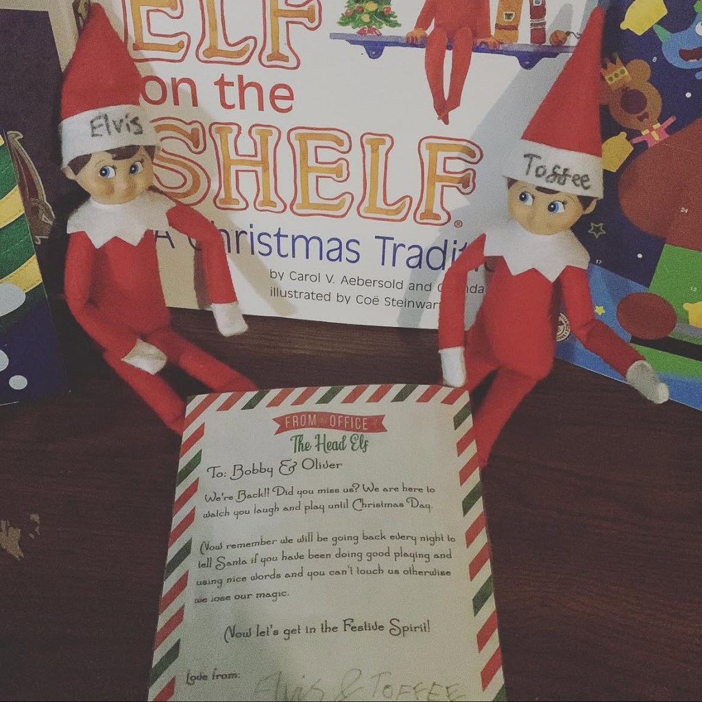 Fast forward to 2019, when my youngest turned two, and we decided it was only fair he had his own elf too. Enter Toffee — Elvis’s mischievous sidekick and partner in holiday crime!