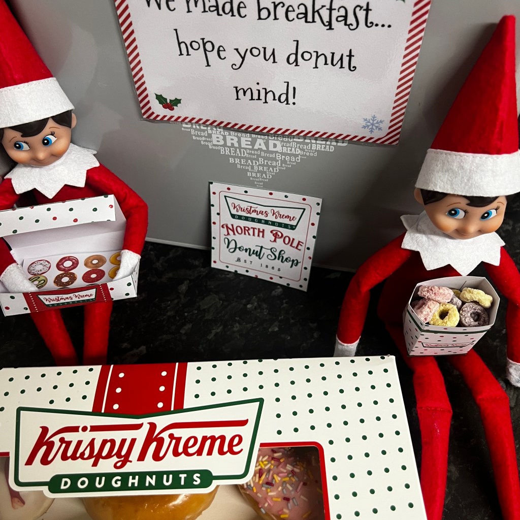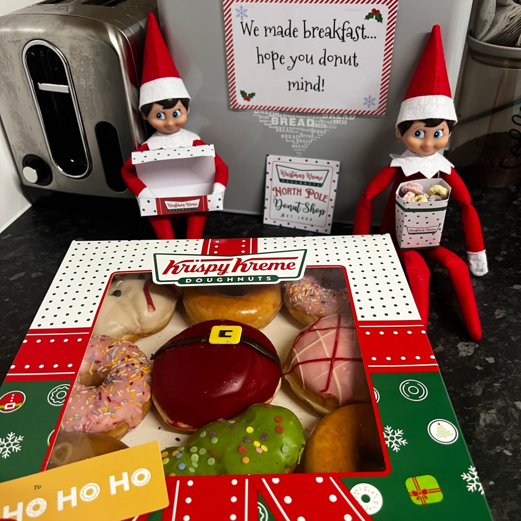 Okay, this one comes with a wholesome twist because my O.H. — who never gets involved with anything elf-related — actually surprised me on his way home from his night shift. He walked through the door holding a box of doughnuts ready for the elves’ setup (which was meant to be for today!).
