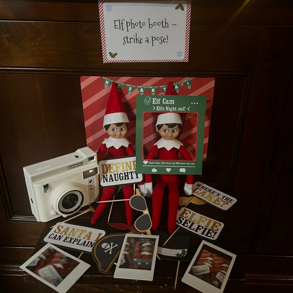 This one was pure joy to set up! I found some adorable printable elf-sized photo booth props and a mini booth template online, printed them, and glued the props onto cocktail sticks. To add a realistic touch, I used my Polaroid camera to take a few photos of the elves “posing” — the kids were convinced they took the pictures themselves! Their laughter when they saw the tiny elf photos was absolutely priceless.