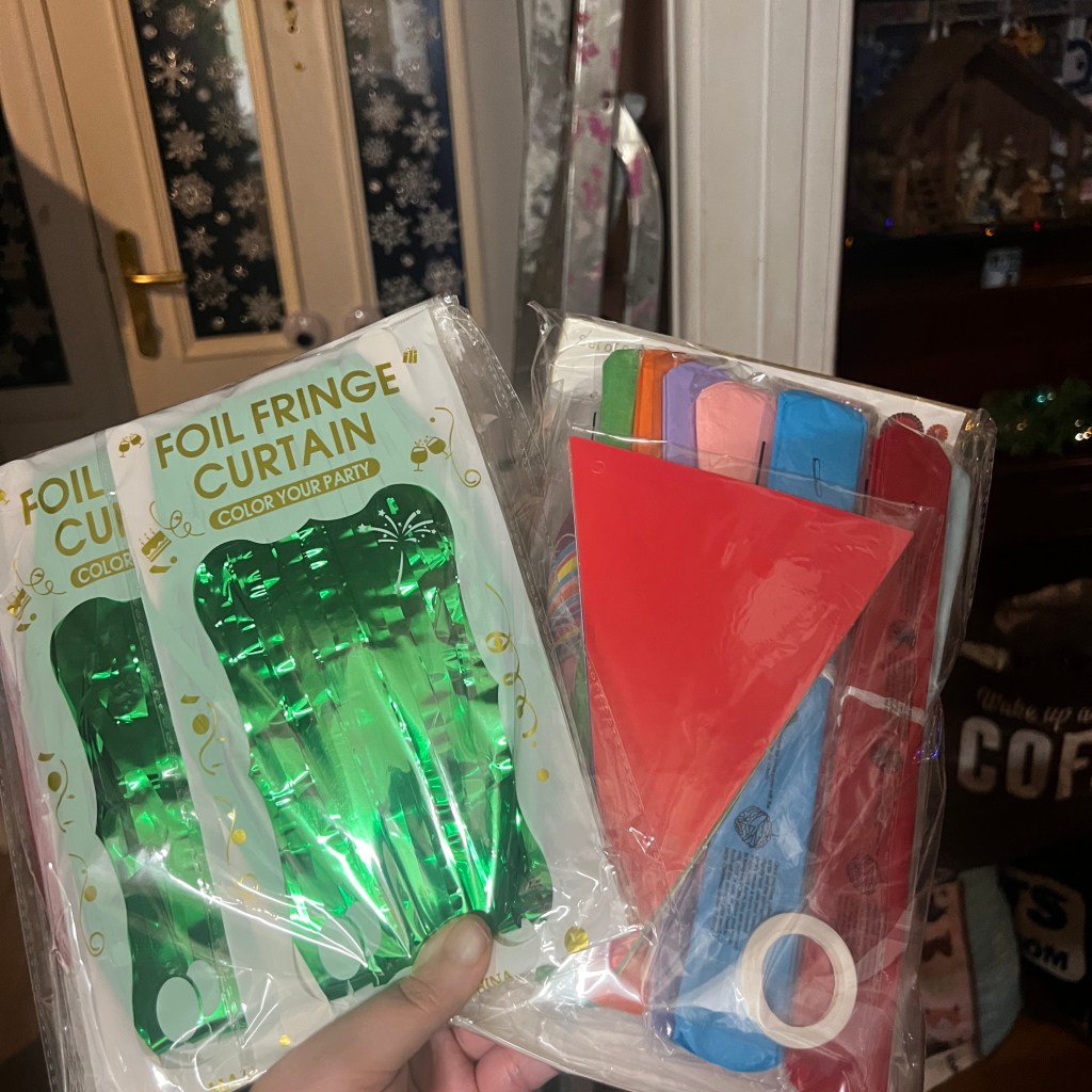 - If you’re like me and never keep decorations, grab a few cheap bits from the supermarket’s party aisle or card shop. I found this party pack and these foil door fringes on Amazon