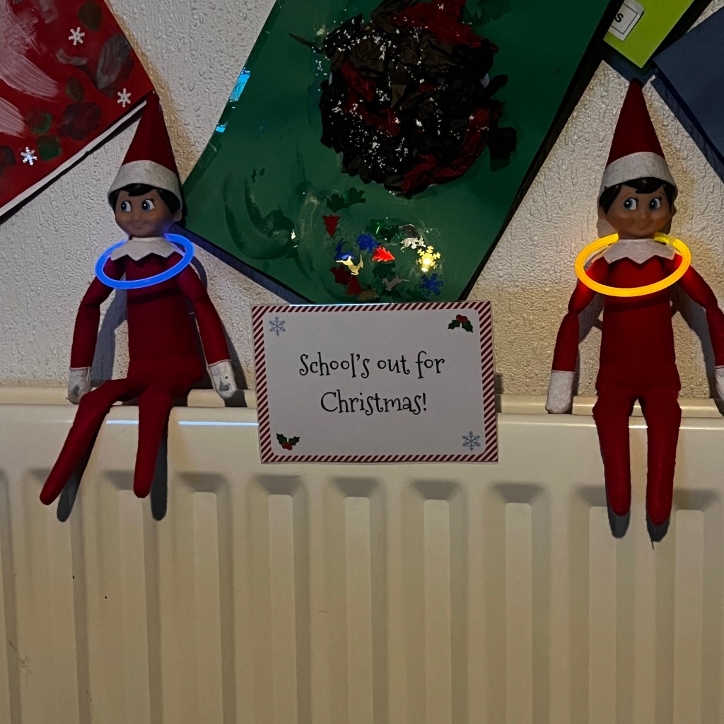 Because the space is so tiny there’s absolutely no room for the elves to sit in there, so they ended up perched on the radiator in the living room instead — each one wearing a glow stick necklace like they were fully ready to party. Bright, silly, and the perfect kickoff to holiday freedom! 🎄✨