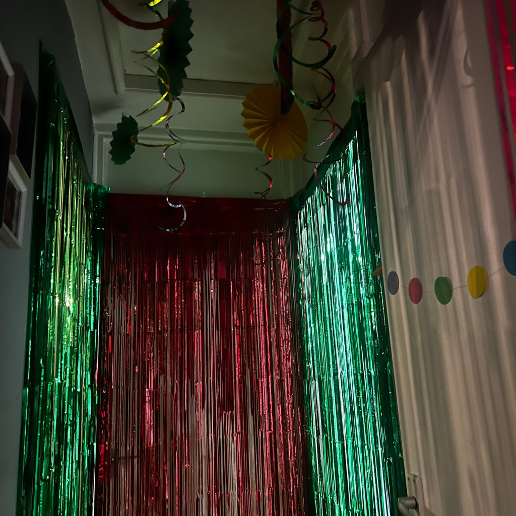 I always decorate the mini hall between the bedrooms and bathroom with foil door fringes (I’ve done it for about three years now), but this year I really jazzed it up with a full party pack I found on Amazon — ceiling decorations, wall bits, the lot. They’re staying up until they fall down, get ripped (those foil door fringes always suffer because the eldest insists on a dramatic flick-open entrance), or until I finally take all the Christmas decorations down.