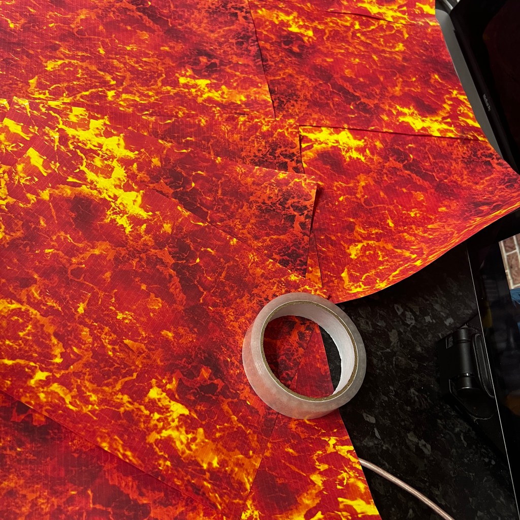 I printed out a bunch of lava pictures, stuck them together into one giant molten masterpiece, and taped it across the floor. Then, with some very strategic tape and a steady hand, Elvis and Toffee were “secured” halfway up the wall, looking like they were scaling for dear life. It’s one of those setups that looks wild but is actually super easy — and the reaction from the kids was gold!