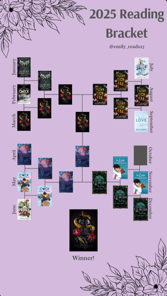 After working my way through all these reads, narrowing them down felt only fair — and slightly painful. This book bracket is my attempt to crown the standouts of the year, pitting favourites against each other based on vibes, reread potential, emotional damage, and pure enjoyment.
