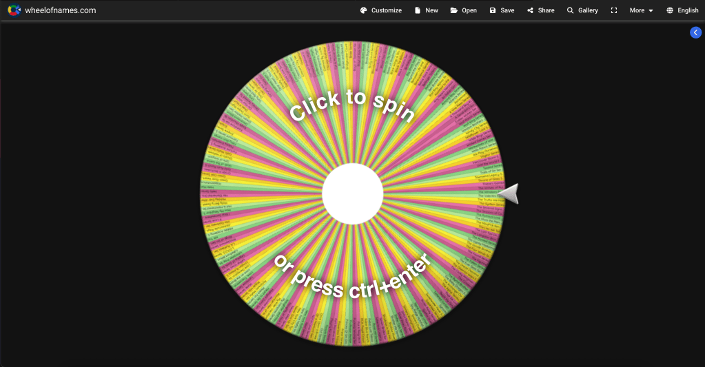 I use Wheel of Names — yes, the website you probably associate with classrooms and giveaways — and I turned it into my personal reading overlord.